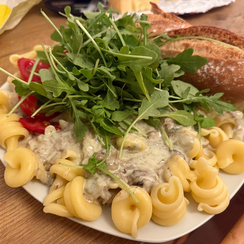 I made a blue cheese and mushroom cream sauce with five different mushroom species (parasol, cèpe, European lion's mane, puffball, and huitlacoche.